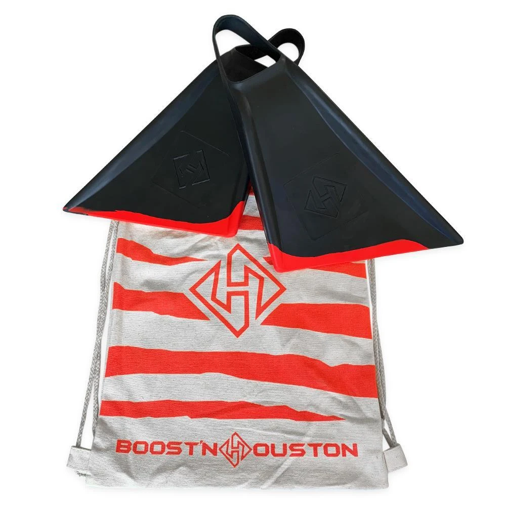 The new Boost’n Houston Swim Fins are designed with high-performance all Natural Malaysian rubbers that feel lightweight on your feet and float well in the water. The soft foot pocket and stiff fin blade deliver the perfect combination of comfort and power. Our straight angled-cut blade means you can kick faster and catch waves easier. Designed and tested by Multiple-Time Bodyboard World Champion, Jared Houston. Jared Houston’s signature swim fins feature his favorite “Red Tiger” colorway, Black and Fluro Red. They come inside a 100% cotton drawstring bag to carry your favorite bodyboarding supplies.
